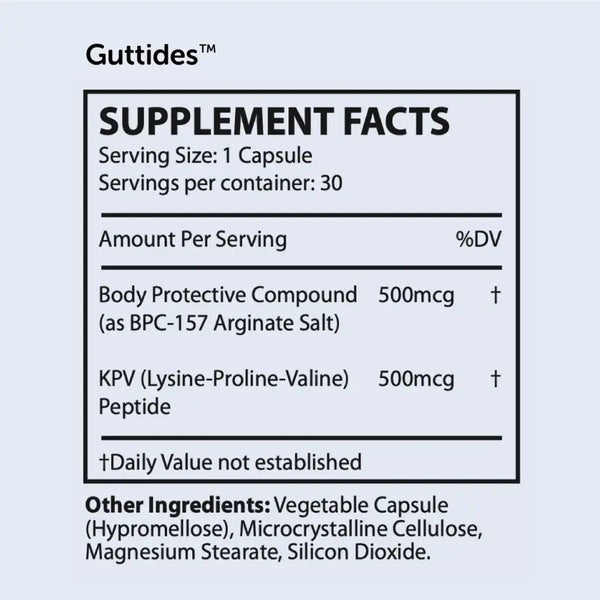 “Guttides” are a blend of gastrointestinal-focused peptides, specifically BPC-157 and KPV, recognized for their unique benefits in promoting gut health through anti-inflammatory actions and protective effects.