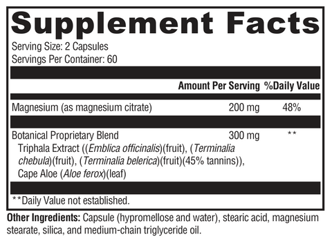 Med Colon Cleanse is designed to support gastrointestinal (GI) regularity and complement dietary fiber intake. Magnesium citrate is present to support muscle relaxation and bowel elimination. Cape Aloe is added to support normal GI transit time and stool bulk. Triphala, a balanced blend of astringent fruits used extensively in Ayurveda, is present to support all phases of digestion, assimilation, and elimination. Gastrointestinal regularity, in turn, plays a fundamental role in detoxification, providing a major route for elimination of toxins.*