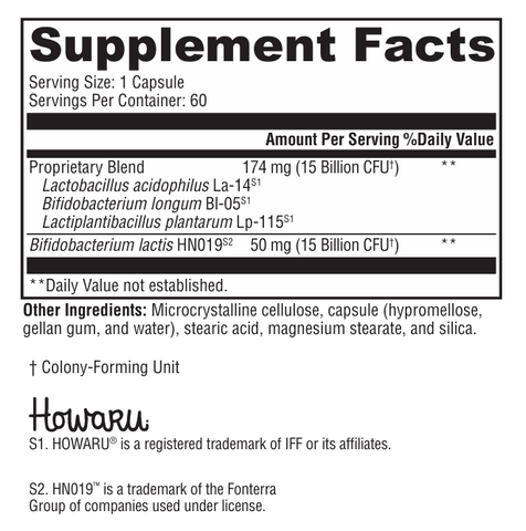 including HN019®, an extensively studied strain of Bifidobacterium lactis. These live microorganisms have proven health benefits, well-established safety, and have been tested for epithelial cell adhesion and/or resistance to low pH.*This formula features DRcaps™ gastro-resistant vegetarian capsules to further support resistance to low pH and delivery
